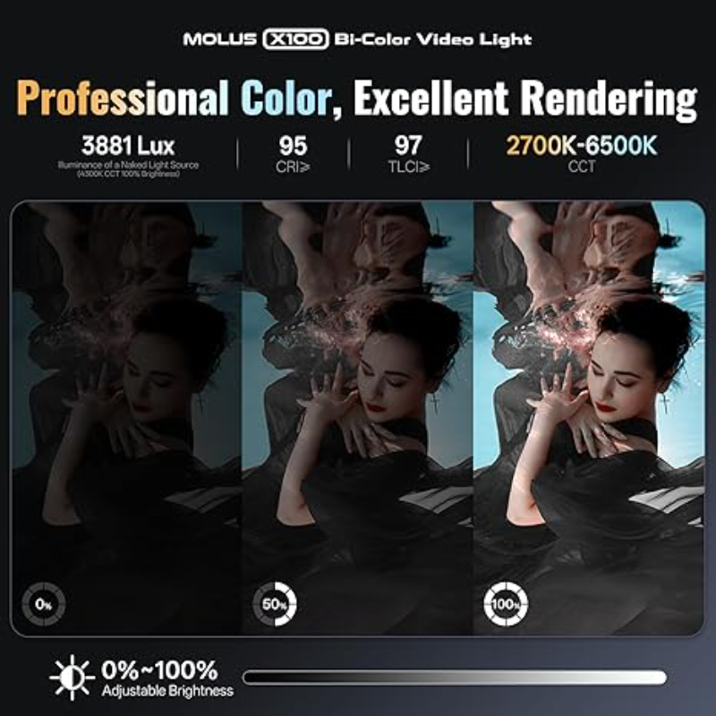 ה-X100 Pro מספק אור אחיד ועוצמתי עם נאמנות צבע גבוהה, הודות לערכי CRI ו-TLCI גבוהים, המבטיחים צבעים מדויקים וגווני עור טבעיים בכל תנאי צילום. טמפרטורת הצבע המתכווננת מאפשרת התאמה מושלמת לסביבות תאורה שונות ולסגנונות צילום מגוונים.