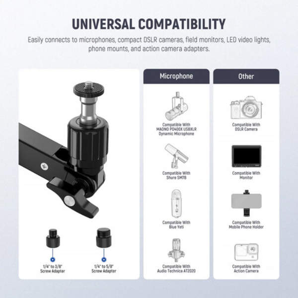 מתאים למיקרופונים, מצלמות קטנות, צגים או אביזרי שידור אחרים — תמיכה במשקל של עד כמעט ‎2.5 ק״ג.