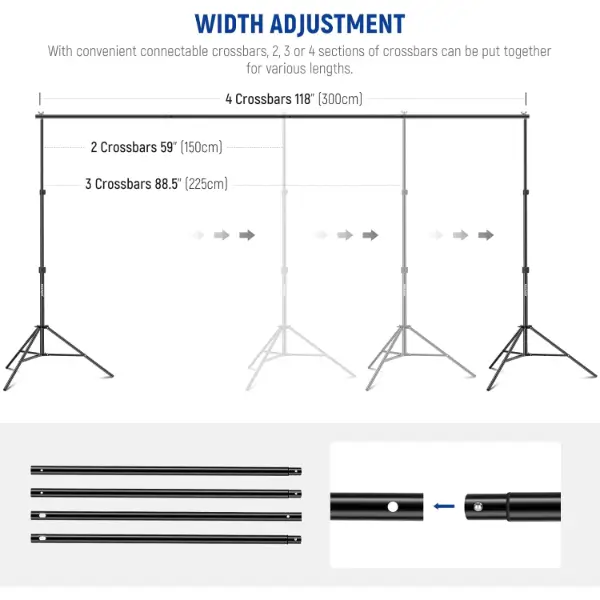 עם גובה מתכוונן (2.3'-7'/0.7m-2.1m) ורוחב (5'-10'/1.5m-3m), מערכת התמיכה לרקע מחזיקה את הרקע שלך במקום ועוזרת לך ליצור רקעים שונים לעבודות צילום