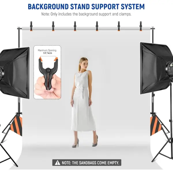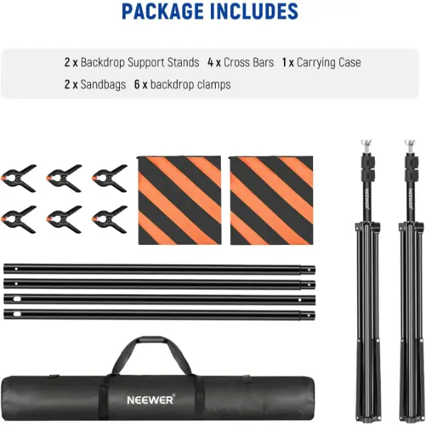 מגיע עם 2 מעמדי רקע, 4 מוטות צולבים, 2 שקי חול כתומים ואביזרים אחרים כדי להבטיח תמיכה יציבה לרקע שלך. אידיאלי עבור סטודיו לצילום, מסיבות, חתונות ואירועים אחרים