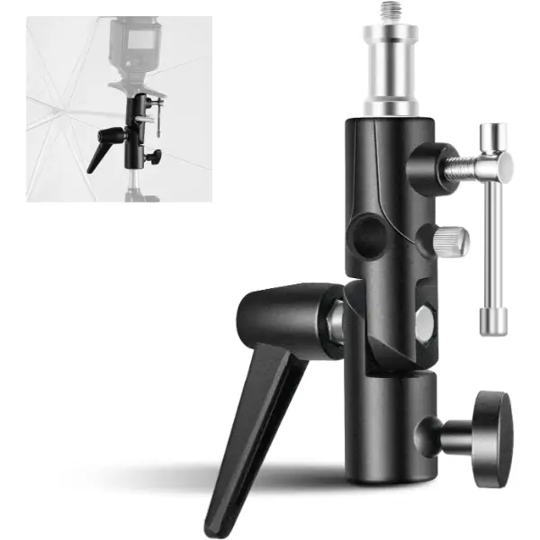 הכנס בקלות מטריה או סופטבוקס דרך השקע ואבטח אותה על התושבת. השתמש במטריה יחד עם פלאש Speedlite כדי לרכך ולהפיץ את תאורת הבזק. זווית מתכווננת גם כן