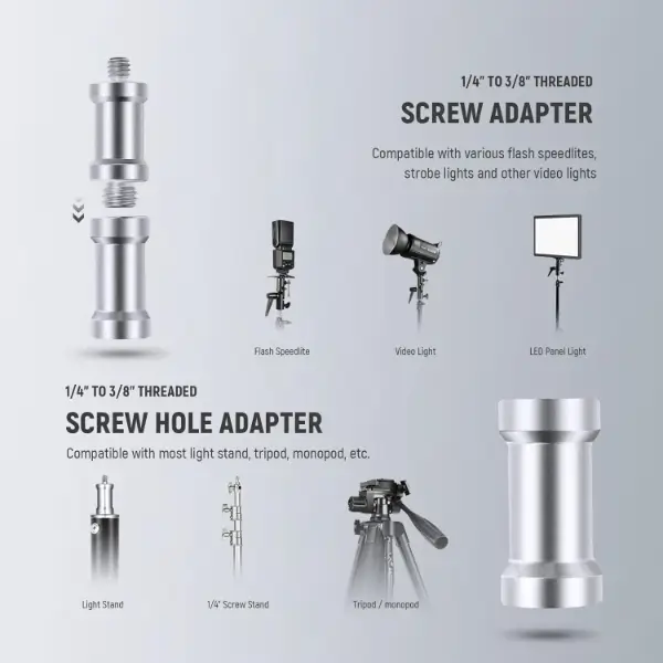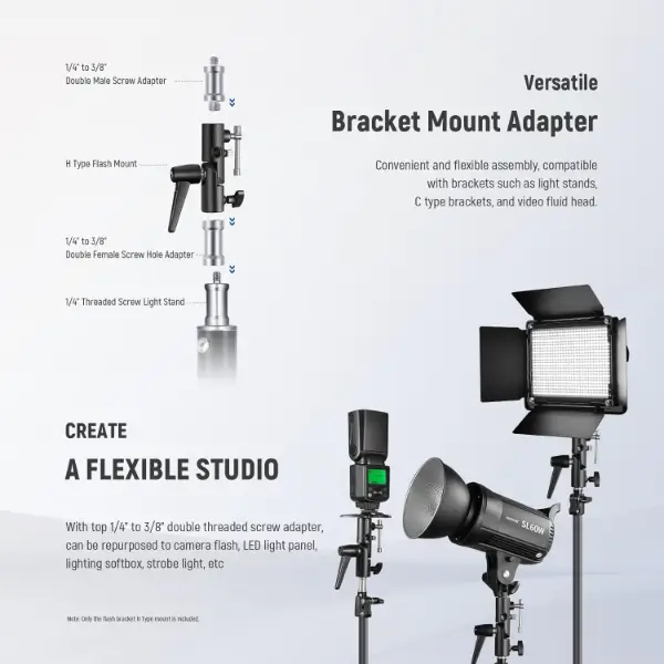 מעוצבים עם מתאמי ברגים עם הברגה כפולה בגודל 1/4 אינץ' עד 3/8 אינץ', תושבות פלאש גמישות אלו ניתנות ליישום כדי להחזיק פלאש Speedlite, פאנל אורות LED, תאורה סופטבוקס, אור נבט, ומכשיר נוסף הניתן להרכבה עם הברגה של 1/4 אינץ' או 3/8 אינץ'