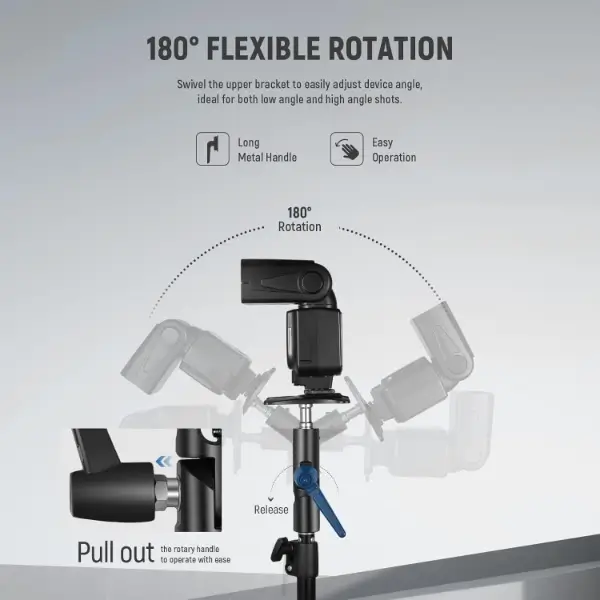 עם שני חלקים המחוברים באמצעות בורג מתכוונן, התושבת העליונה יכולה להסתובב ב-180° כדי למקם את הפלאש או מכשירי צילום אחרים בזוויות שונות, אידיאלי הן לצילומים בזווית נמוכה והן לצילומים בזווית גבוהה. ידית מתכת ארוכה מאפשרת תפעול קל